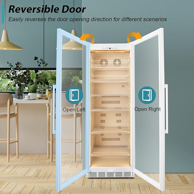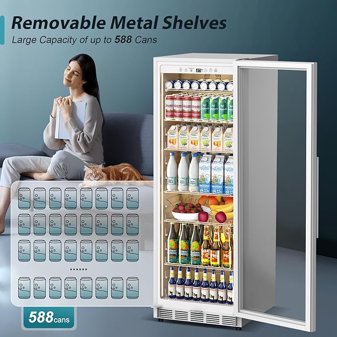 - 【Generous Capacity】With a spacious 13.8 Cu Ft interior, the dimensions of this display refrigerator are 23.54"×27.17"x65.75" (W x D x H), accommodating up to 630 standard 12 oz cans