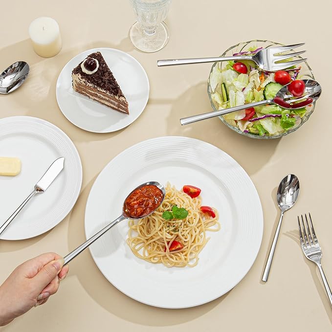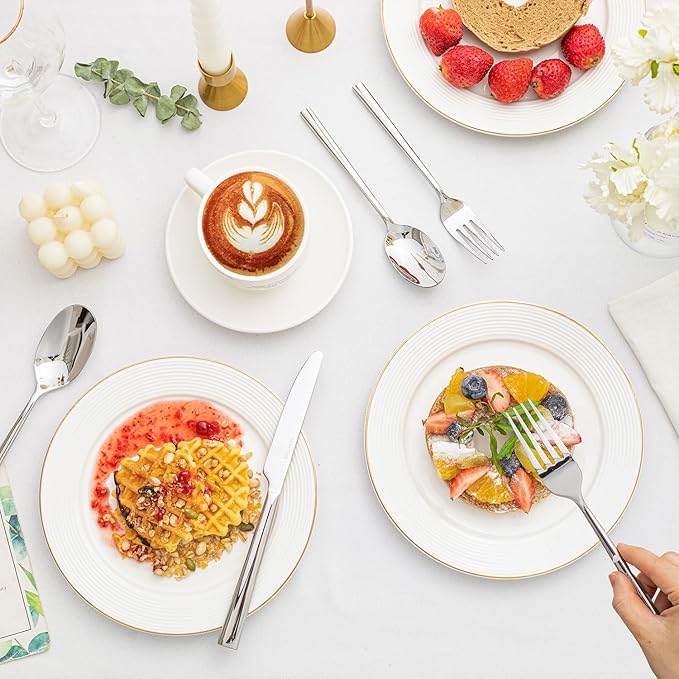 - DESIGN AND APPEARANCE: Mirror finish, natural and elegant design.Smooth and silk surface without grain, easy to clean and care in daily use. Crafted forged process,strong and durable,so that the flatware set has a thicker texture.