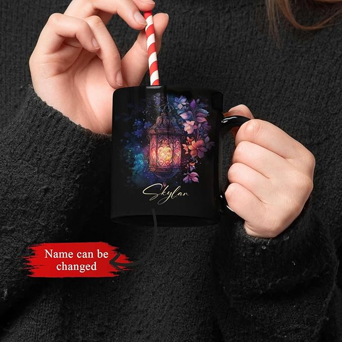 - đăUNIQUELY PERSONALIZEDăIlluminate your mornings with this Custom Vintage Lantern with Flowers Coffee Mug. Featuring a glowing lantern surrounded by beautiful flowers, this black ceramic cup gift for those who appreciate nature and enchanting designs. Personalize it with a name to create a unique mug gift for friends or loved ones. Click "Customize Now" to add a personal touch and make this 11oz or 15oz mug a special keepsake.