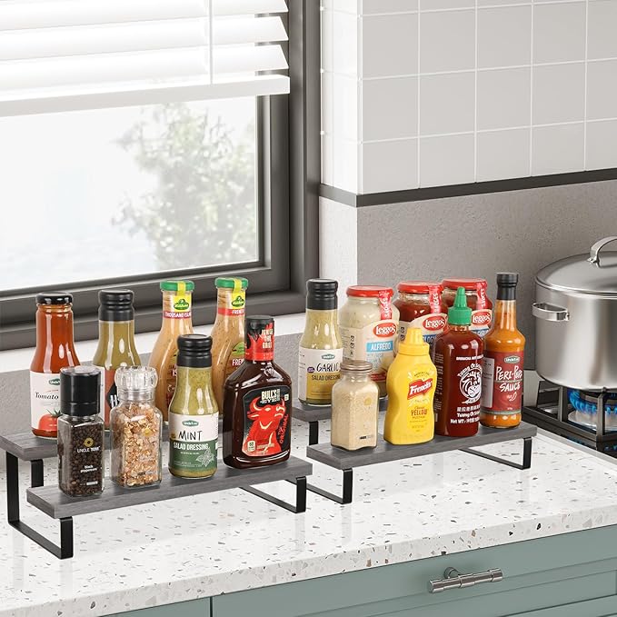 YINMIT Wooden Display Riser Stand, Tiered Perfume and Cologne Organizer Stand, 2 Tier Spice Rack Organizer, Rustic Display Shelf for Candles (2 Tier,2Pack,Grey)