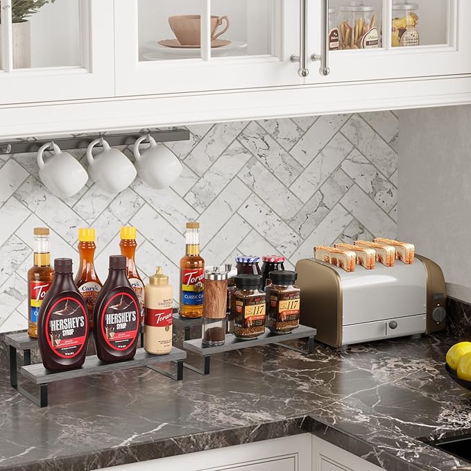 - Quick Setup & Easy Cleaning: You can have this 2-tier display riser stand assembled in 10 minutes with detailed instructions and tools. The wooden surface is waterproof and dust-free, a damp cloth could keep the counter shelf clean. (Assembly tools and accessories are included in the package)