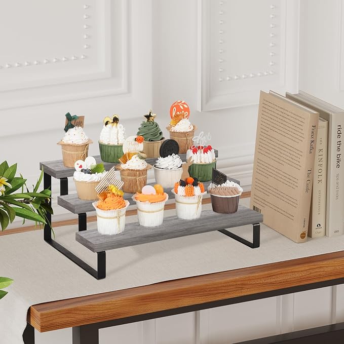 - Convenient Design: The stepped design makes efficient use of your counter space. This wooden display riser is a great idea for displaying toy figurines in cabinets, celebrating party desserts, and cosmetics on the dresser. The raised tiers help to create an eye-catching feature for your items.