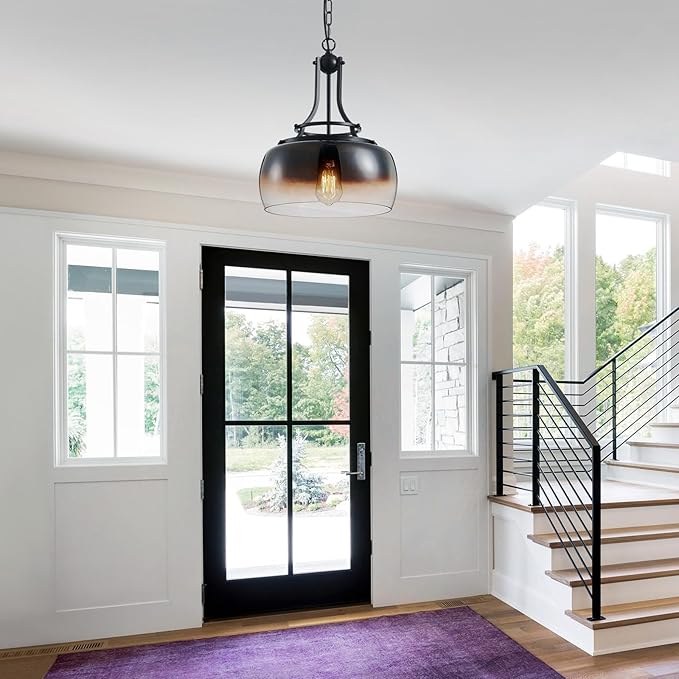 - Design: This rustic farmhouse Wuzups pendant chandelier light with design offers a modern interpretation of a classic urban-industrial style, which adds a vintage flair to your space. It comes in a black finish and features a prominent round amber gradient black glass shade. The mouth-blown glass has a few pinprick bubbles that add to the vintage look and feel.
