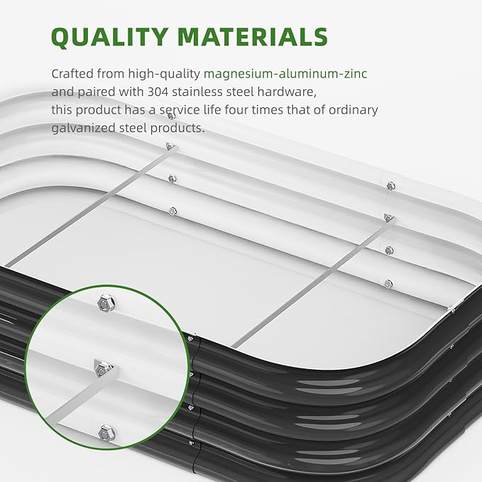 - Sturdy and Durable Materials: Made from high-quality zinc-magnesium aluminum alloy steel, this raised flower bed is built to withstand the elements while providing a secure environment for your plants to thrive. With a remarkable lifespan of over 30 years, this garden bed is built to withstand the test of time.