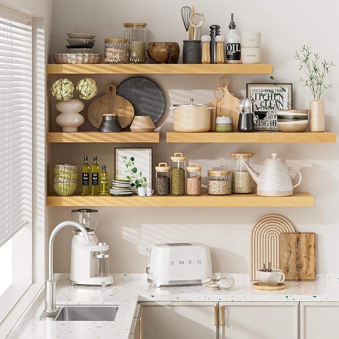 - Perfect Wall Decor: Handcrafted from premium 1.5" thick wood, our wood floating shelves boast a unique wood grain that infuses your space with timeless charm. Perfectly suited for any modern, traditional, rustic, or farmhouse decor, this shelf elevates the ambiance of your home and kitchen. With 4 colors and 4 sizes, you can creatively arrange your storage space with your style.