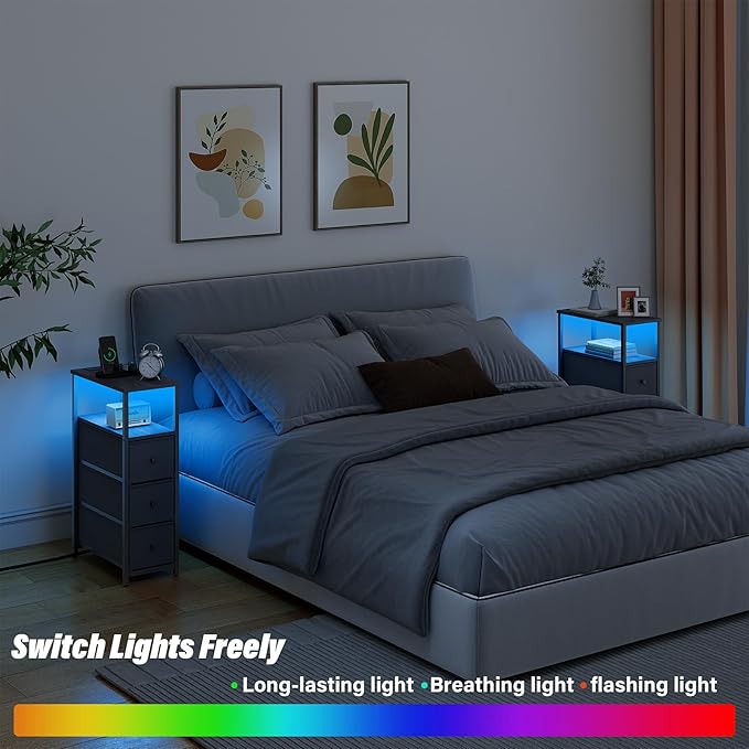 TUTOTAK Narrow LED Night Stand with Charging Station, Slim End Table with Plugins, Tall Side Table with 3 Fabric Drawer, Small Bedside Table with Storage, Set of 2, for Living Room, Black TB01BK073L
