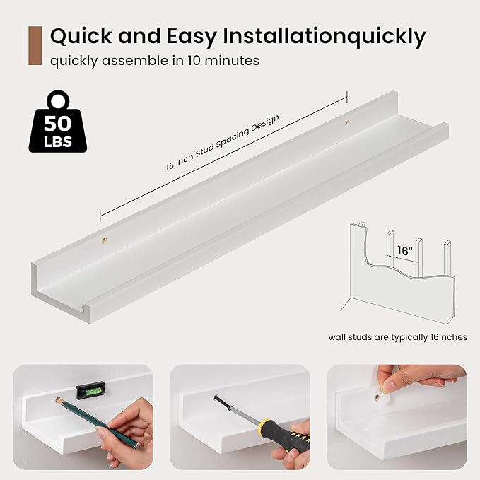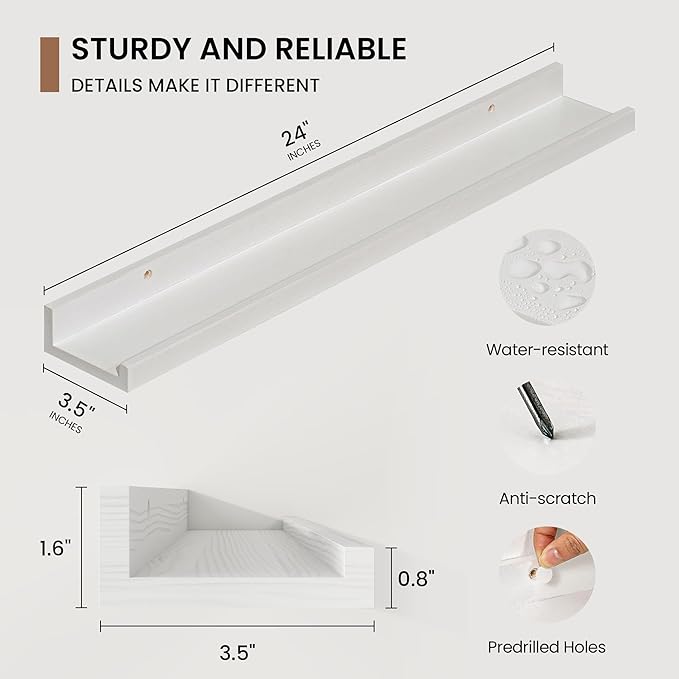 - 3.5" Floating Picture Ledge: Anti-Slip Narrow Design-3.5" ultra-narrow depth holds frames/plants without sliding, even on angled walls. Stud-Mounted Stability-16" pre-drilled holes match standard studs (hardware incl.) for wobble-free install. Clutter-Free Aesthetic-Clean lines blend with farmhouse/Scandinavian decor, focusing on your treasures