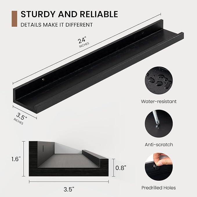 - 3.5" Floating Picture Ledge: Anti-Slip Narrow Design-3.5" ultra-narrow depth holds frames/plants without sliding, even on angled walls. Stud-Mounted Stability-16" pre-drilled holes match standard studs (hardware incl.) for wobble-free install. Clutter-Free Aesthetic-Clean lines blend with farmhouse/Scandinavian decor, focusing on your treasures