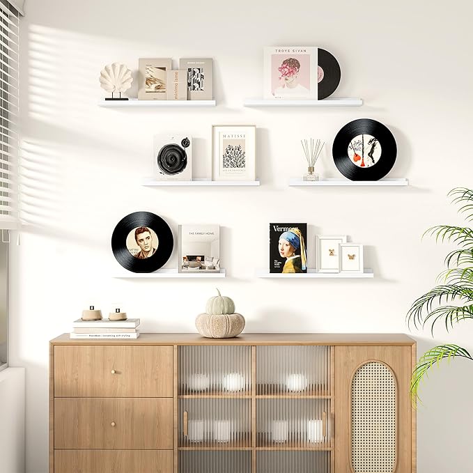 - 3.5" PICTURE LEDGE DESIGN: Ideal for displaying photos, artwork, or collectibles, these feature a thoughtful extremely narrow 3.5-inch width ledge design to prevent items from sliding forward, its mounting holes are spaced 16 inches apart for secure mounting to wall studs uncluttered aesthetic