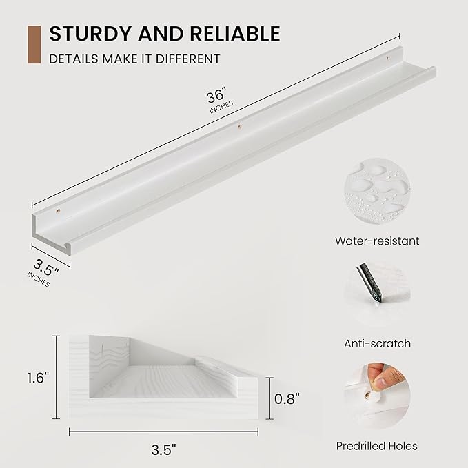 - 3.5" Floating Picture Ledge: Anti-Slip Narrow Design-3.5" ultra-narrow depth holds frames/plants without sliding, even on angled walls. Stud-Mounted Stability-16" pre-drilled holes match standard studs (hardware incl.) for wobble-free install. Clutter-Free Aesthetic-Clean lines blend with farmhouse/Scandinavian decor, focusing on your treasures