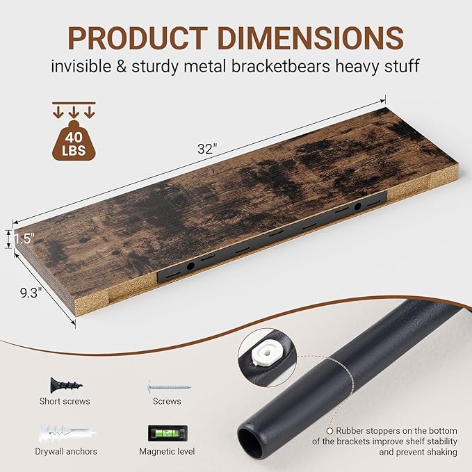 - 【Longer Design】Our pretty rustic brown floating shelves are 32"W x 9.3"D x 1.5"H.Our 32 floating shelves is longer than traditional designs and can hold more items.The brown floating shelves optimize wall space,helping organize essentials without taking up floor space in your home.