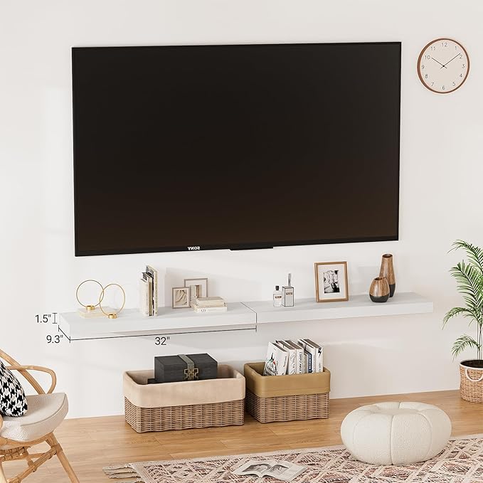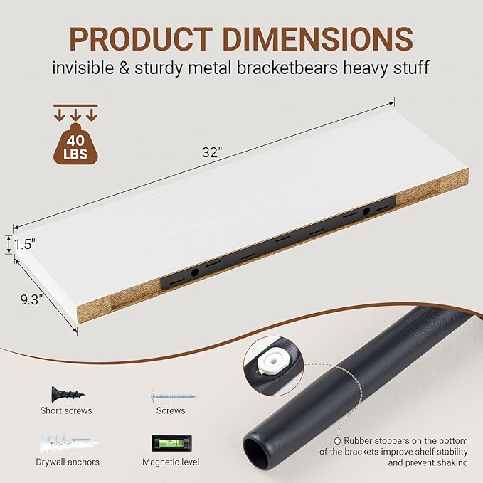 - 【Longer Design】Our pretty 32 inch white wall shelves are 32"W x 9.3"D x 1.5"H.Our 32 floating shelves is longer than traditional designs and can hold more items.The white floating shelf optimize wall space,helping organize essentials without taking up floor space in your home.
