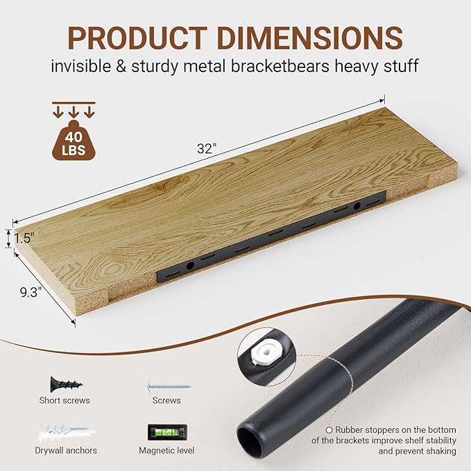 - 【Sturdy & Reliable Material】The floating shelves for wall 32 inches long use metal brackets and screws to be firmly fixed to the wall without sagging.Our oak floating shelves are made of high quality MDF material,can hold up to 40 lbs to safely place your items.