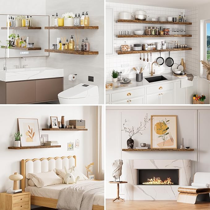 - 【Longer Design】Our pretty wall shelves are 48"W x 9.3"D x 1.5"H.Our brown floating shelves is longer than traditional designs and can hold more items.The rustic brown floating shelves optimize wall space,helping organize essentials without taking up floor space in your home.