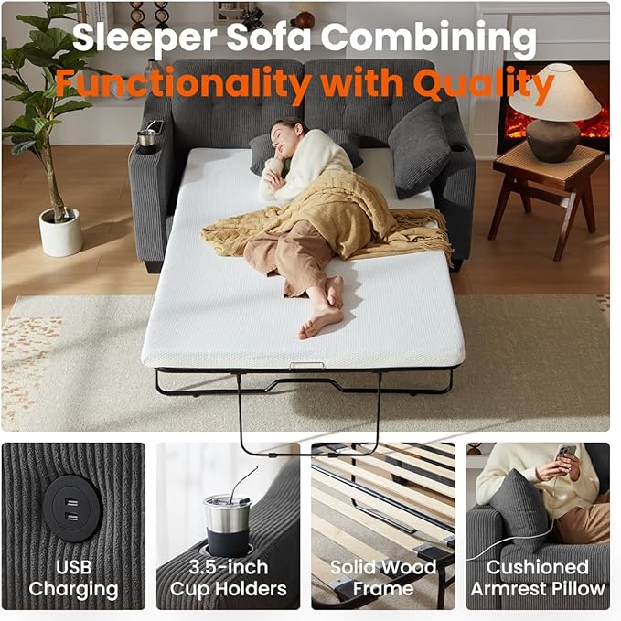 Pull Out Sofa Bed, Full Size Sleeper Sofa, 2-in-1 Convertible Corduroy Couch with USB Charging, Memory Form Couch for Living Room, Apartment and Small Space (Dark Grey, Corduroy - Full Size)