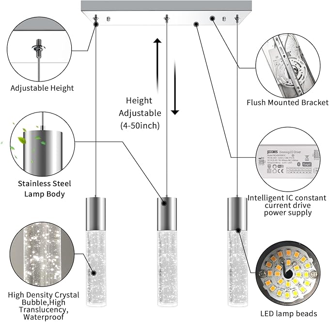 - 【Versatile Modern Design Beyond the Kitchen】 From industrial-chic dining rooms to minimalist bedroom vanities, this adjustable pendant light blends with any decor. Pair multiple units over conference tables or studio workstations. Dimmable pendant light with ETL dimmable driver can achieve 0%-100% brightness adjustment but needs to be used with smart voice or App control.