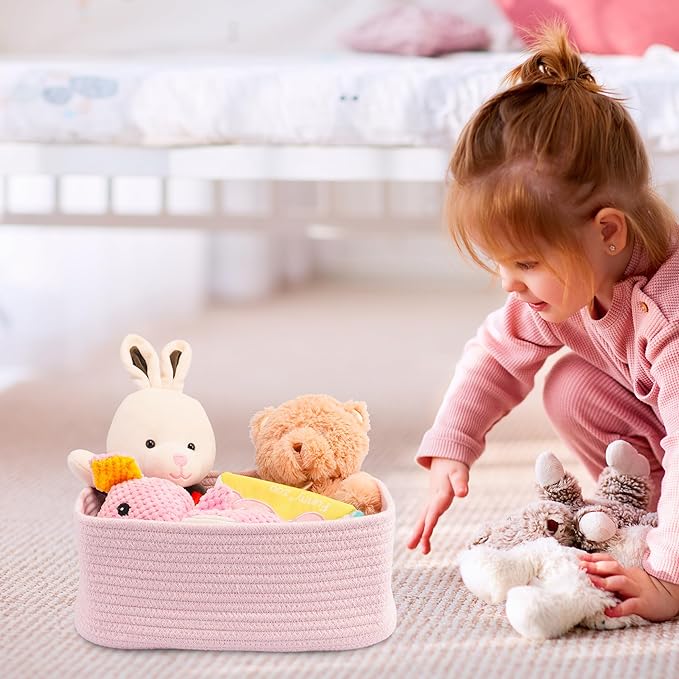 Small Woven Storage Baskets 12“X8”X5“ Decorative Rope Bins for Organizing Shelves, Closets, and Toys, Empty Gift Baskets, Cute Organizer Basket for Home and Office (pink, regular)