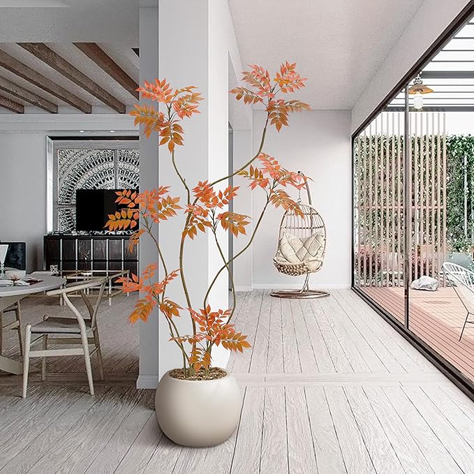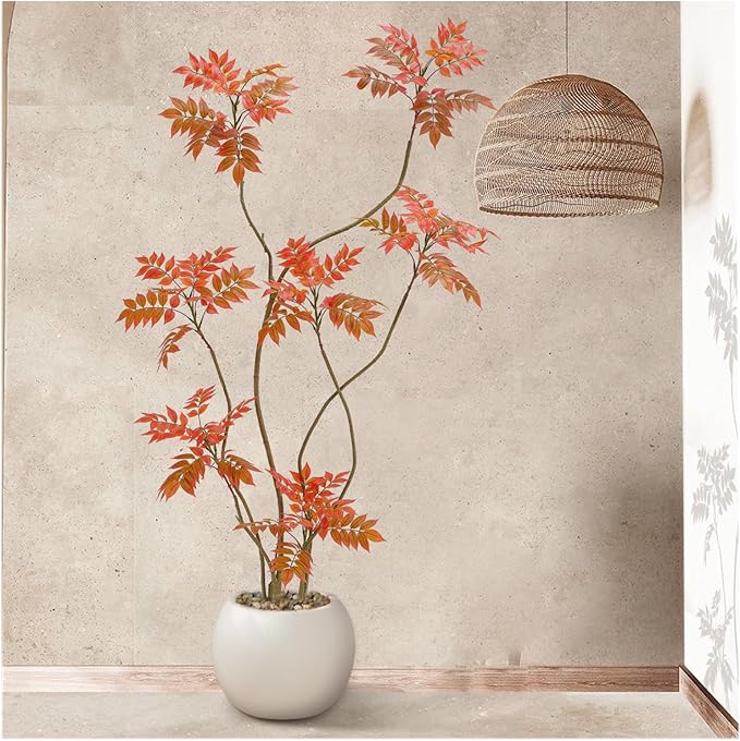 - Home Decor Accents: This 6ft/70in tall faux sumac tree contains 500 pieces real touch leaves who made of silk and each leaf has veins on it. Inclus a white planter(10"H x 10"W). The interior of the planter is made of sturdy concrete and the surface is decorated with non-falling coloured pebbles and the base use anti-tip tilt protection for greater stability