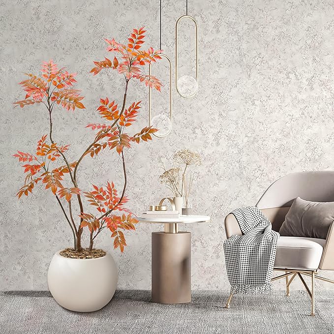 - Home Decor Accents: This 5ft/60in tall faux sumac tree contains 500 pieces real touch leaves who made of silk and each leaf has veins on it. Inclus a white planter(10"H x 10"W). The interior of the planter is made of sturdy concrete and the surface is decorated with non-falling coloured pebbles and the base use anti-tip tilt protection for greater stability