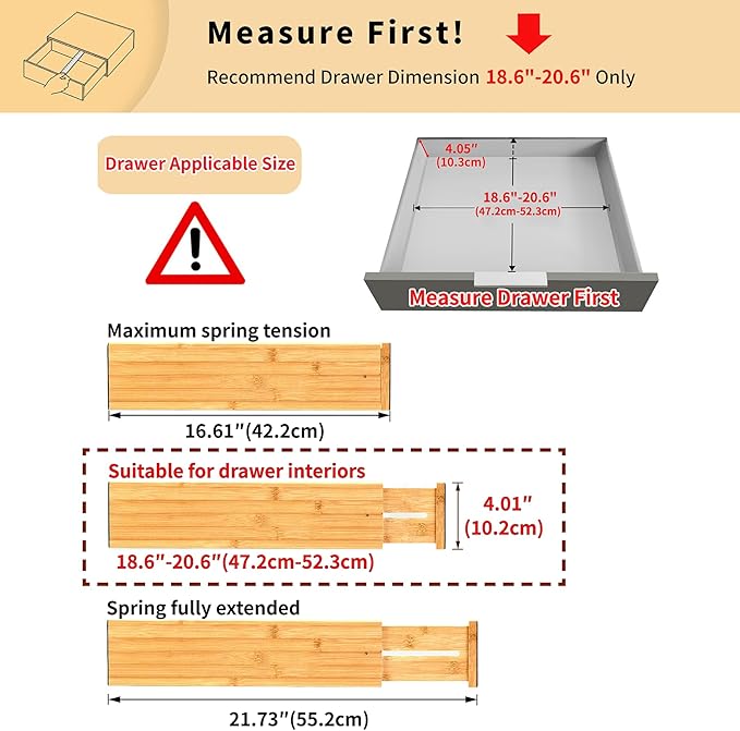 - 【Check Drawer Size Before Purchase】 **Important**: Fits drawers **18.6" to 20.6" wide (inner size only)**. If your drawer is **wider than 20.6"**, it will doesn't work. If it's **narrower than 18.6"**, the divider will be **too tight or not fit properly**. Please ensure your drawer’s inner height is greater than 4.05" for a proper fit. **Always measure before buying!**