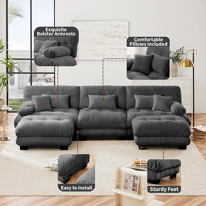 U Shaped Couch Sectional Couch, 3-Seater Cloud Couch Sectional Oversized Couch, Sofa Bed Couch with Round Bolster Armrests 5 Pillows, Modular Couch Home Sofa Living Room Couch(Gray)
