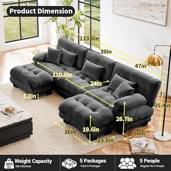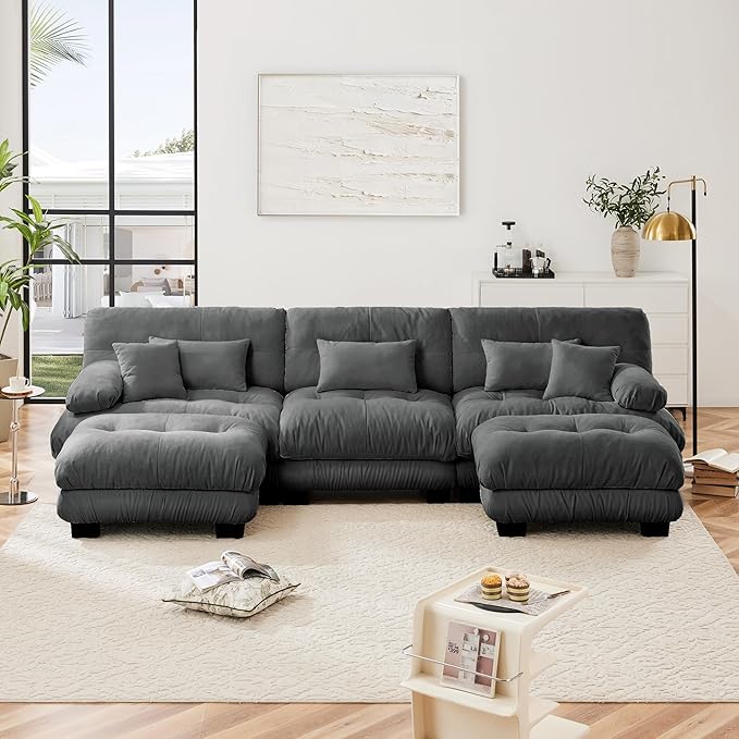 - Oversized U-Shaped Couch: This is a modern sectional couch with 2 ottoman. The 3-seater sofa couch is made of soft, durable, and exquisite vintage chenille fabric, it offers comfort and soft seating for everyone sitting on it. Exquisite round bolster armrest designs with well-filled inside provide comfort support for the hands, while sitting on it the bolster armrest can also provide your head with the appropriate radian and support