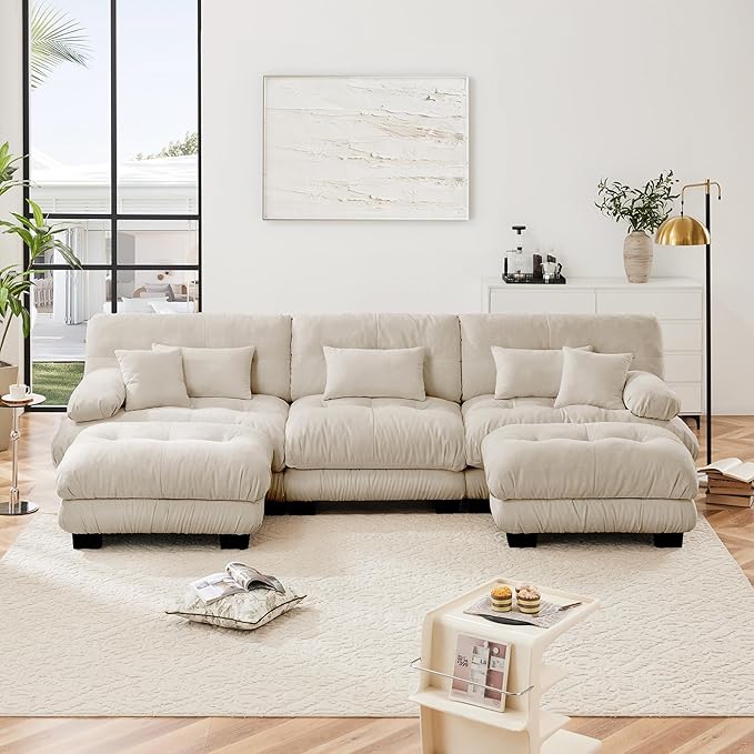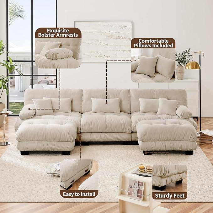 - Oversized U-Shaped Couch: This is a modern sectional couch with 2 ottoman. The 3-seater sofa couch is made of soft, durable, and exquisite vintage chenille fabric, it offers comfort and soft seating for everyone sitting on it. Exquisite round bolster armrest designs with well-filled inside provide comfort support for the hands, while sitting on it the bolster armrest can also provide your head with the appropriate radian and support