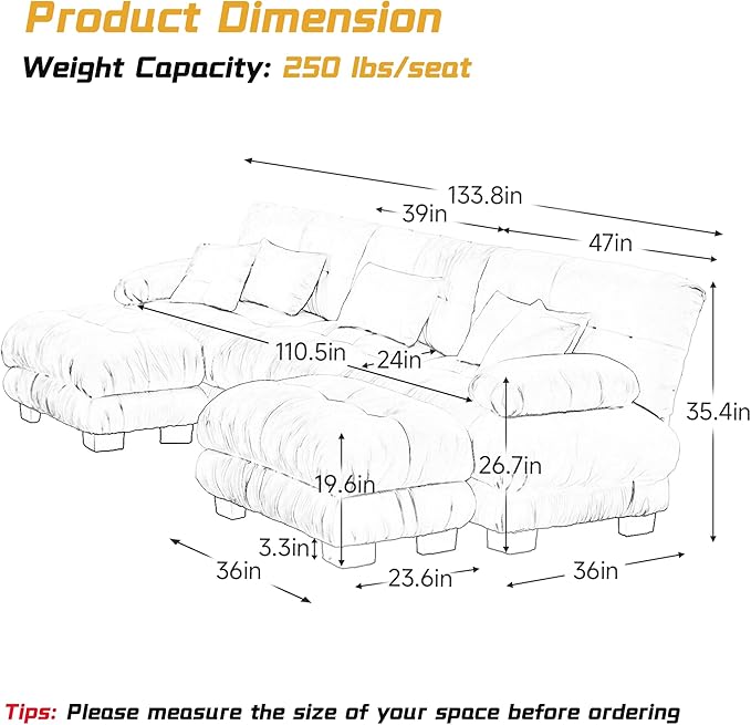- Product Dimensions : 36"D x 133.8"W x 35.4"H