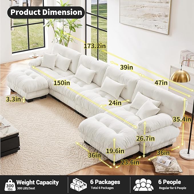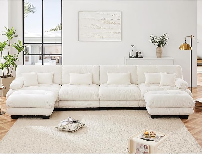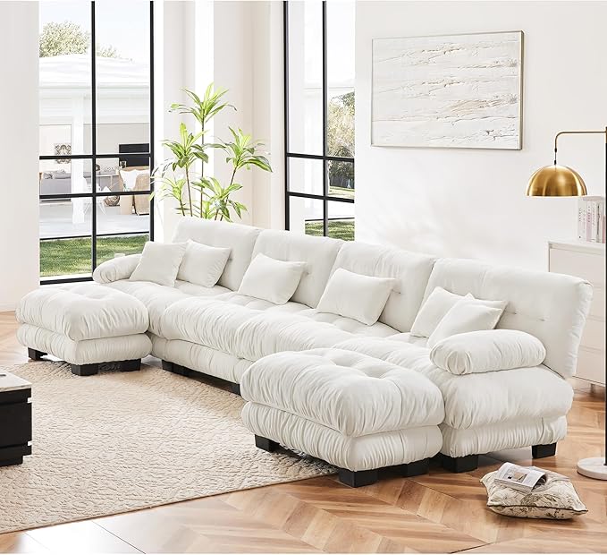 U Shaped Couch Sectional Couch, 4-Seater Cloud Couch Sectional Oversized Couch, Sofa Bed Couch with Round Bolster Armrests 6 Pillows, Modular Couch Home Sofa Living Room Couch(White)
