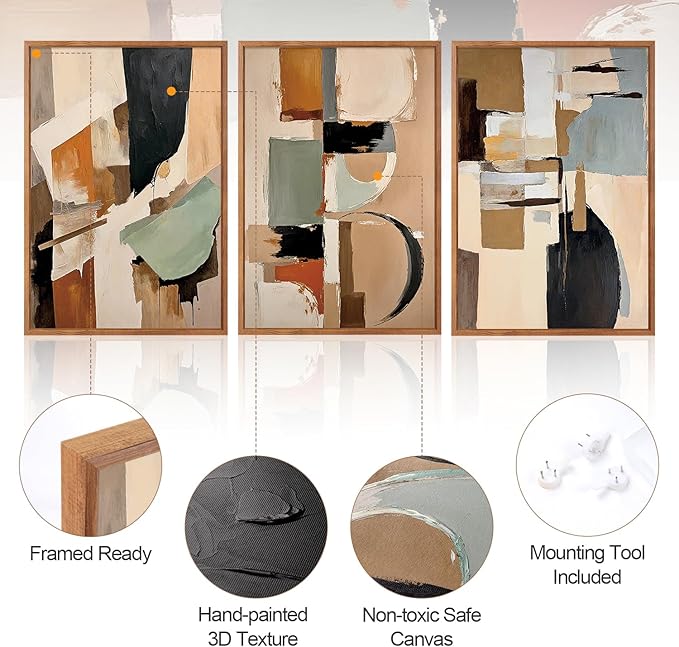 - Hand-painted Oil Painting on Canvas-- The boho japandi framed canvas artwork is set of 3, each size is about 16"x24" and printed on non-toxic safe canvas. Hand painted 3D textured petals make it more vivid.