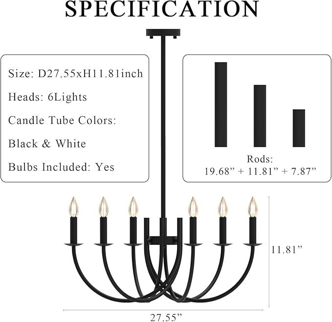 - 【Specification】 Size: D27.55xH11.81inch / D70xH30cm. The Length of Pendant Rods: 39.37inch / 100cm (Adjustable). The Rods: 7.87inch + 11.81inch + 19.68inch. Heads: 6Lights. Color: Black. Metal Tubes Color: Black + White (Includes Black and White Colors Metal Tubes). Lamp Socket: LED E12. Emitting Color: Warm White 3000K. Bulbs Included: Yes. Wattage: 18W.