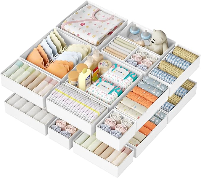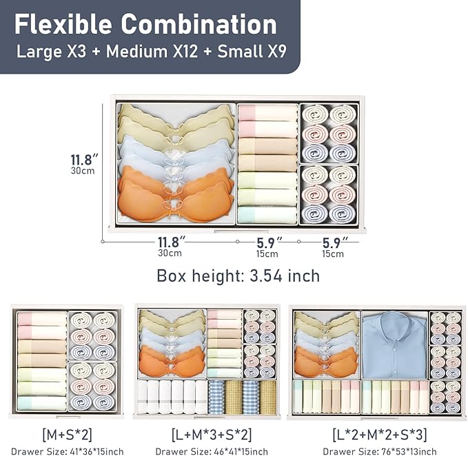- [Perfectly matching your drawers] : This clothes organizer set includes 15 storage bins in various sizes to fit all your needs: 3 large (11.8*11.8*3.54"), 12 medium (11.8*5.9*3.54"), and 9 small (5.9*5.9*3.54"). Great for organizing clothes, sock, underwear, bra, baby clothing, scarves, shirt, pants, belt, ties, bikini and more