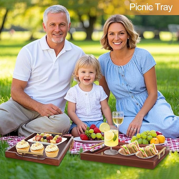 - [SELECT YOUR HANDLE COLOR] Why not cost one money to get double happiness? Try our deluxe large dark brown wooden tray for ottoman with 2 sets of handles. Now we offer two colors premium polished black and gold for replacement. Let's test your operational ability with the fantastic wood serving tray.