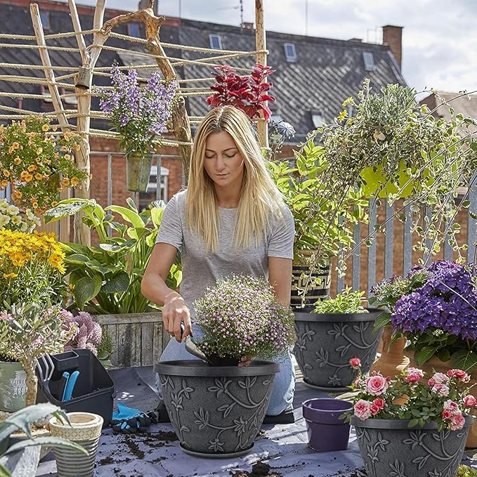 - 【High Quality Materials】8 inch flower pots are made with recyclable ABS,lightweight, so you can lift it easily. Outdoor planter resistant to withstand harsh sunlight and harsh winters without breaking down over time or faded,suitable for home and garden herbs,mints,cactus and snake plants for Plants Growth, you can use it indoors and outdoors freely.