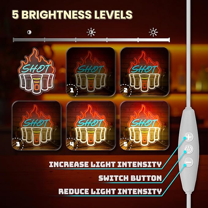 - 【Dimmable】 Liquor neon sign has 3 smart buttons that can adjust the brightness from 10% to 100% to meet your different lighting needs. After you adjust the brightness, turn it off, and when you turn it on again, the neon sign light will still be the brightness you adjusted, without you having to adjust it again.