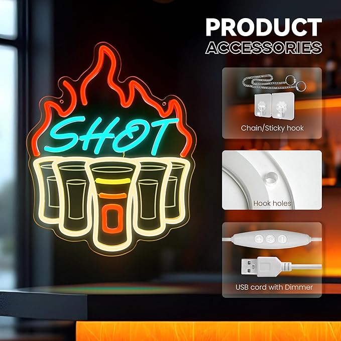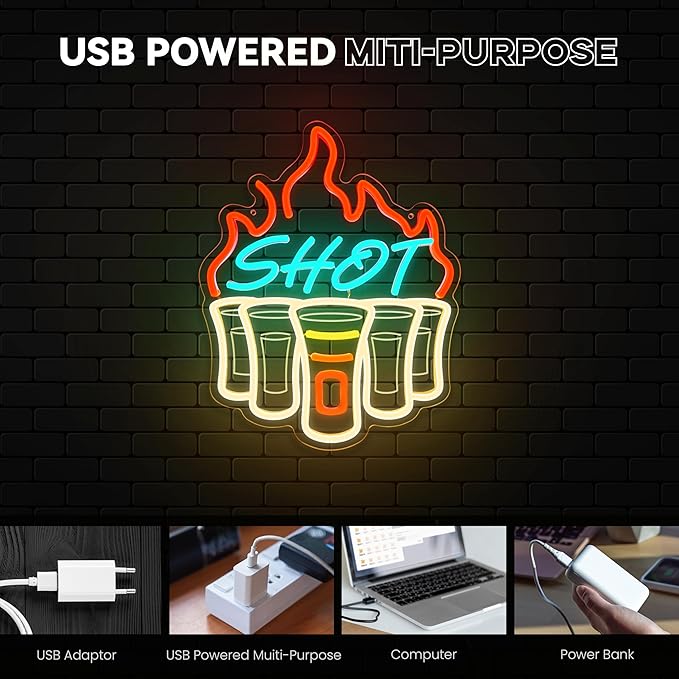 - 【Shot Neon Sign】 I believe that many people like to drink shot wine. This neon light can perfectly create a hot, joyful and tipsy atmosphere, making people can't wait to drink a glass of shot wine and let the alcohol bloom hotly in their mouths.