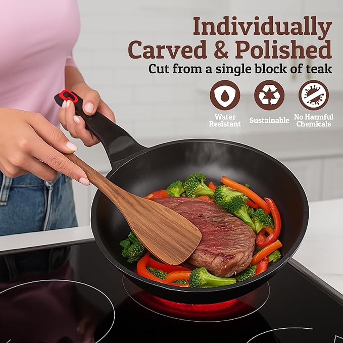 - Safe for Nonstick, Built for Everyday Cooking - These teak utensils are gentle on nonstick, ceramic, and cast iron cookware - no scratches, no damage. Use them to stir soups, flip pancakes, mix sauces, or serve dinner right at the table. Their heat-resistant handles and naturally rounded edges make them a go-to set for busy home cooks who want to protect their pans and enjoy cooking more.