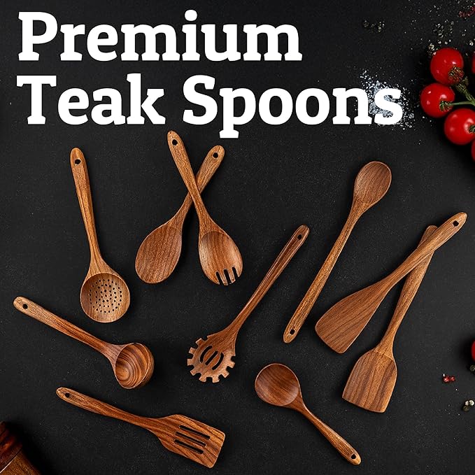 - Complete, Organized, and Ready for Any Recipe - This 10-piece teak set includes a flat spatula, wok spatula, mixing spoon, long-handle mixing spoon, serving spoon, salad fork, slotted skimmer, slotted turner, soup ladle, and spaghetti spoon - plus a spoon rest for effortless organization. Each piece is hand-polished from solid teak and built to last with no coatings, seams, or shortcuts - just clean, everyday-ready tools.