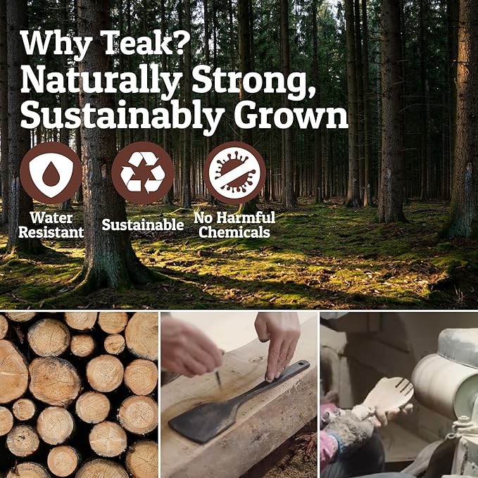 - Individually Carved from a Single Piece of Premium Teak - Each utensil is carved from one solid block of responsibly sourced teak - no joints, glue, or fillers. After shaping, it’s hand-polished to a smooth, contoured finish that highlights the natural grain and feels great in your hand. Sealed with a food-safe, water-based resin to help resist wear and moisture, this is a set built for beauty, comfort, and everyday kitchen use.