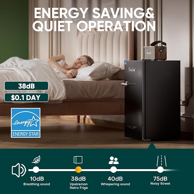 - Quiet & Energy-Efficient: Operating at a whisper-quiet 38 dB and equipped with automactic defrost technology, this mini fridge consumes just 258 kWh annually, delivering energy savings without compromising comfort. It's more economical for long-term use. Making it ideal for office, bedroom or dorm