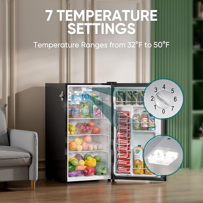 - Adjustable Thermostat: From 32°F to 50°F, this small refrigerator offers 7 temperature settings to optimize storage for different products. With its capability to cool from 86°F to 32°F in just about 3 hours, you can quickly achieve your desired temperature. The hidden evaporator design ensures a stable temperature in the refrigerator, preventing cold air from blowing directly on the food, keeping your food fresh at all time. The smart LED lighting automatically illuminates upon opening, convenient for taking food out at night