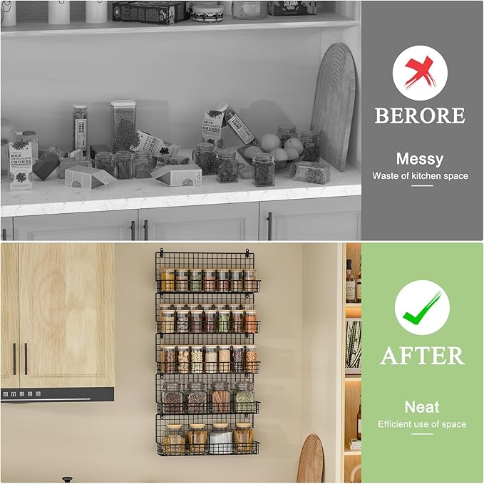 - 【Durable & Efficiently】The 5-tier wall mount spice rack made of by thicken iron wire, to make it more stability and durability, and mounting hardware included. This wall mounted spice rack is specially designed for kitchen and pantry storage. It can be hung on the wall or on a cabinet door. The spice rack for wall can efficiently utilize the unused space in the kitchen to keep your kitchen tidy.