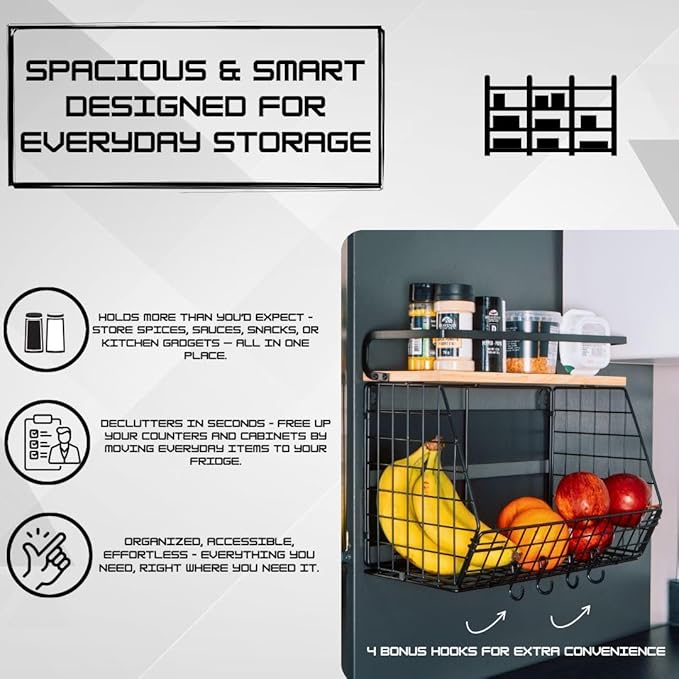 - ✅ Bonus 4 Hooks for Added Versatility – Store More Than Ever Each Magnobasket includes 4 removable side hooks that easily clip onto the basket’s sides. Hang spatulas, oven mitts, towels, keys, or other everyday tools — perfect for customizing your setup and maximizing vertical storage space.