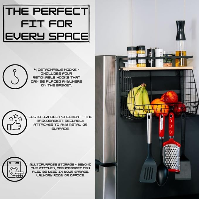 - ✅ Multi-Surface Compatibility – Perfect for Kitchens, Laundry Rooms & More Whether it’s your refrigerator, washer, dryer, oven, or any other metal surface, the Magnobasket turns unused vertical space into organized storage. Great for small apartments, RVs, or anyone needing extra room — ideal for keeping your go-to items within easy reach.