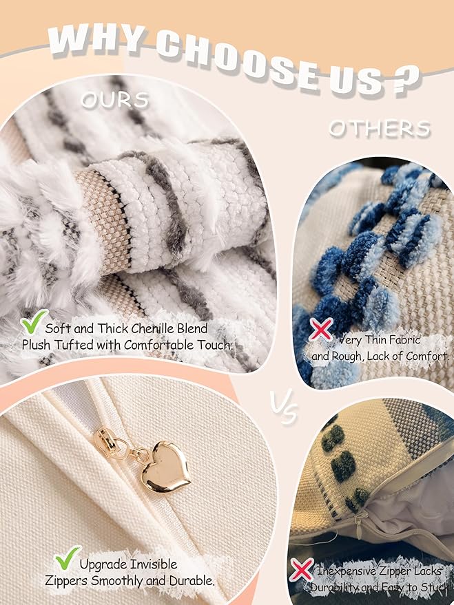 - PREMIUM QUALITY FABRIC: Made from a high-quality chenille and woven polyester blend, the throw pillow covers are ultra-soft and durable. The tufted design adds texture and dimension, creating a luxurious and inviting atmosphere.