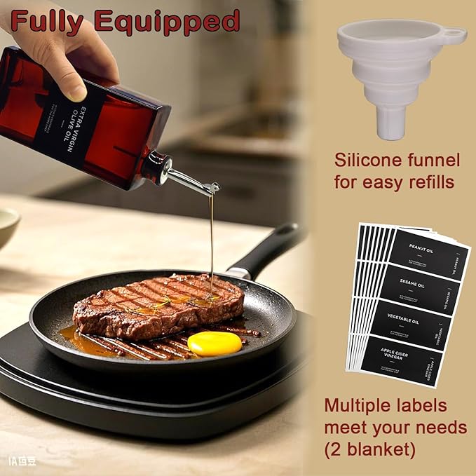 - Drip-Free Precision Pouring for Effortless Cooking: Say goodbye to spills! Our kitchen oil dispenser bottle features stainless steel drip-free pourers ensuring clean, controlled pours every time. Perfect for drizzling olive oil, dispensing vinegar, or pouring soy sauce. This dispensador de aceite de cocina (botella para aceite de cocina) makes cooking and serving precise and tidy.