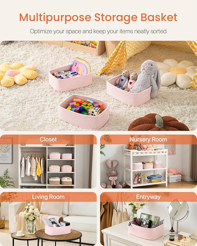 KALLAX Small Woven Basket, 13.5 x 9.5 x 5 Inches, Storage Basket for Organizing, Cute Small Rope Shelf Closet Cube Storage Bins Baskets for Shelves, Dog Toy Gift Baskets Empty, 3 Pack Light Pink