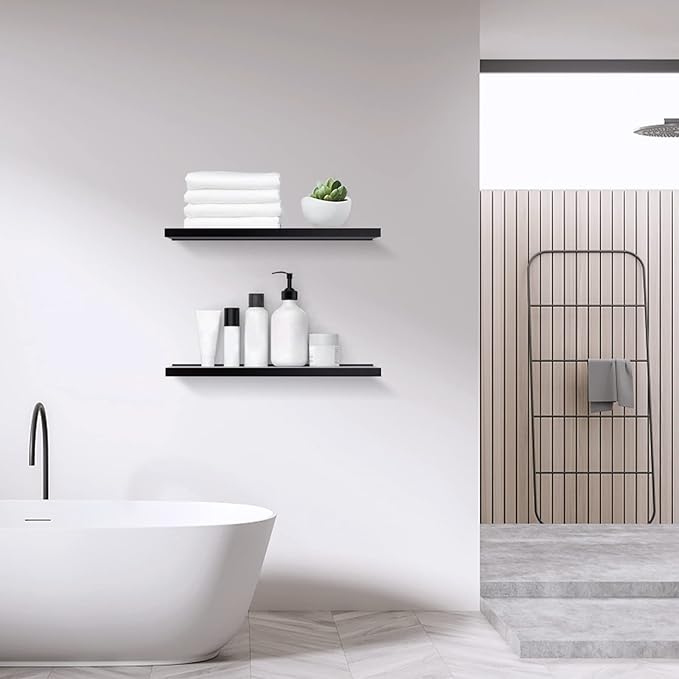 Meangood Floating Shelves Black 17 inch Wall Mounted Natural Bamboo Wood Wall Storage Shelves for Bedroom,Living Room,Bathroom, Kitchen(Set of 2)