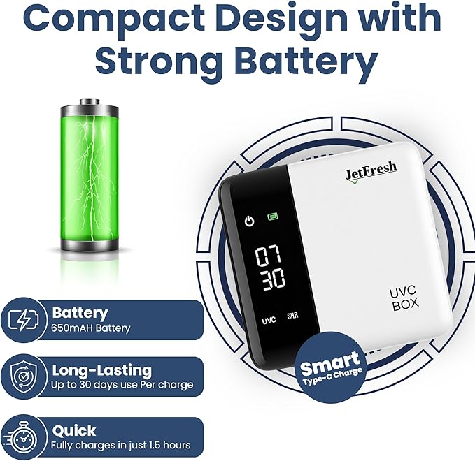 - Cordless, Rechargeable & Travel-Friendly : This compact toothbrush holders UV sanitizer Also works as a protective travel case. Its 650mAh battery lasts up to 30 days per charge and recharges in just 1.5 hours using a Type-C cable, perfect for home, office, or on-the-go.