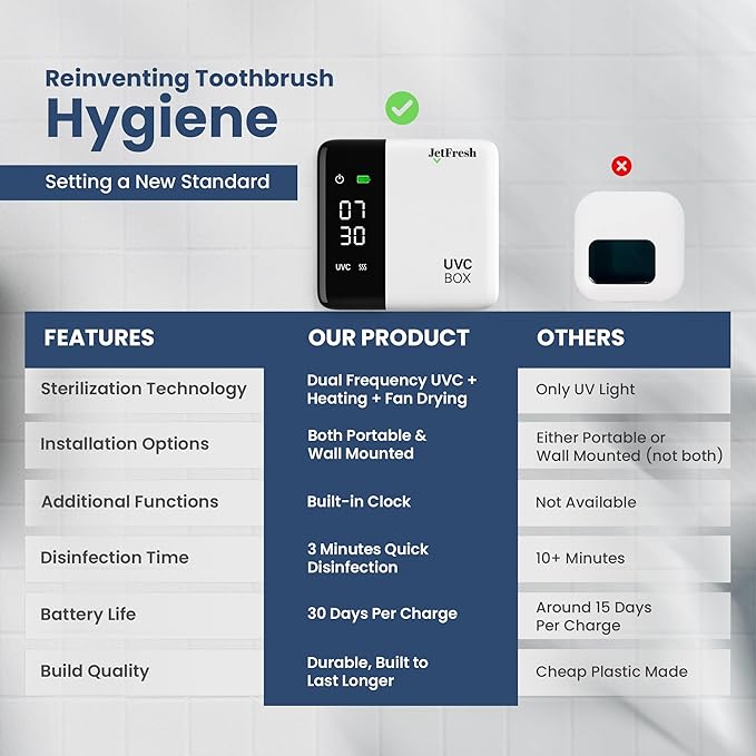 - Precision UV-C Care with Advanced Heating + Fan drying : Eliminate 99.9% impurities with powerful dual-band UV-C light and warm airflow. This UV tooth brush sanitizer holder keeps your brush cleaner and drier making it safe for daily use by the whole family.